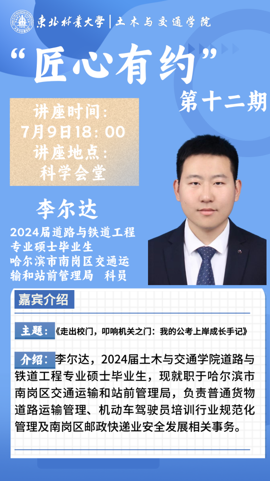 为助力同学们深入了解职场生态,激发同学们探索职业可能性的内在动力和意识,树立同学们主动规划未来的积极态度,同时促进理论与实践的深度融合,土木与交通学院特邀哈尔滨市南岗区交通运输和站前管理局李尔达和中建一局建设发展公司沈阳嘉里中心项目商务部经理王帅杰,为同学们带来“匠心有约”第十二期专题讲座。此次讲座旨在通过两位嘉宾丰富的职场经验,为同学们点亮职业发展的灯塔,拨开人生职业规划的迷雾,指引大家迈向理想职业的征途。